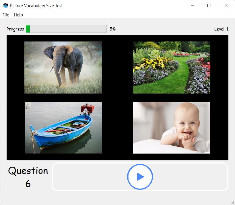 A receptive vocabulary size test using picture choices and oral and written cues designed for pre-literate or l.iterate native speakers and non-native speakers of English. The 20,000 level version can be used with native-speakers of any age. The test was created in collaboration with Paul Nation of Victoria University of Wellington, New Zealand. Remember to download BOTH the main program and one or more test sets. A web-based version (PVST-Web) is also available.